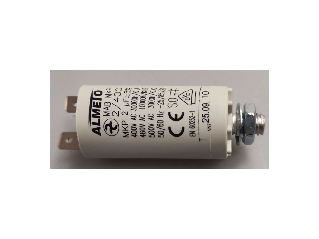 2uF/400V motorový kondenzátor MAB MKP 25x55mm Uvedené jsou rozměry těla bez šroubů a fastonů, průměr x délkaDoplňkové parametry
