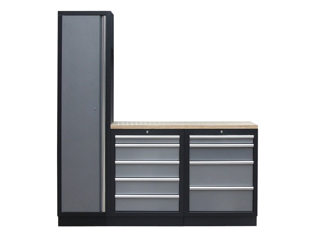 Sestava nábytku v sobě skrývá dostatečné množství úložného prostoru pro vaše nářadí, autotechniku i dílenské vybavení. V kombinaci s bytelnou pracovní deskou získáte multifunkční stěnu, se kterou vám půjde práce od ruky ve všech směrech.