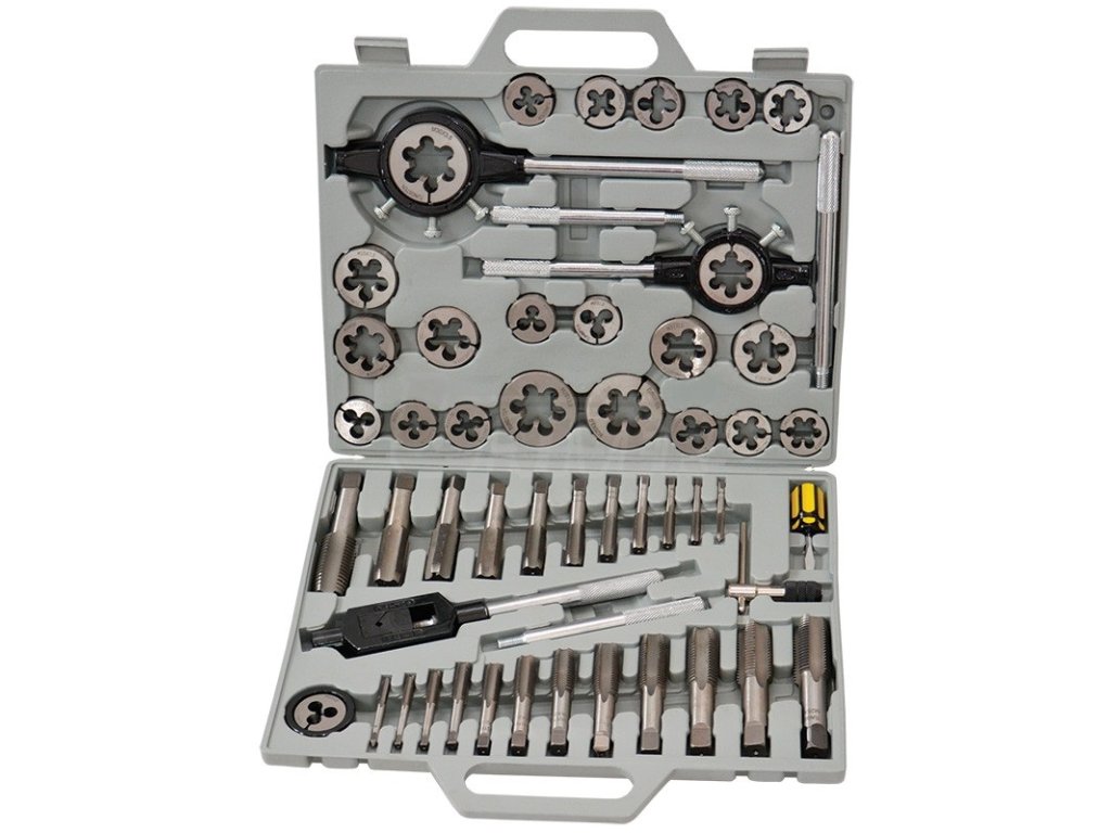 52-dílná sada metrických závitníků a závitových oček z nástrojové oceli.