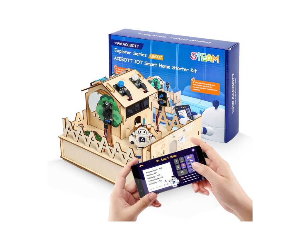 Stavebnice chytrého domečku s Arduinem pro vás hravou formou představí typické funkce chytrého domu nebo zahrady, které se naučíte používat a programovat. <BR/>Ovládání z mobilní aplikace. Možnost grafického programování. Profesionální Arduino deska s USB-C součástí balení.<BR/><BR/>**Funkce domečku:**<BR/>Pokud je šero a někdo projde, světla se rozsvítí a vstupní dveře se zavřou (snímač osvětlení, snímač pohybu PIR, LED světla a servo na dveře).<BR/>Funkce kódového zámku pro ovládání vstupních dveří (LCD displej pro zobrazení stavu, tlačítka pro zadávání kódu, servo pro otevírání dveří).<BR/>Domovní zvonek (modul s tlačítkem, buzzer).<BR/>Kontrola vlhkosti půdy v květináči. Pokud je vlhkost půdy nízká, zapne se bzučák a mobilní aplikace upozorní na chybějící závlahu (snímač vlhkosti půdy, buzzer).<BR/>Pokud je zjištěna koncentrace nebezpečných plynů, bzučák začne pípat (snímač plynu, bzučák)<BR/>Pokud senzor deště detekuje přeháňky, pak servo automaticky zavře okno. Pokud přeháňky odezní, tak se okno zase otevře. (snímač deště, servo)<BR/>Všechny funkce lze ovládat z mobilní aplikace<BR/><BR/>**Upozornění:**<BR/>pro sestavení a zprovoznění domečku je nutná znalost Arduina a programování.<BR/>Knihovny, tutoriály ke staženív odkaze software.<BR/><BR/>Doplňkové parametry