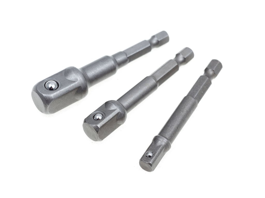 Adaptéry pro 1/4”, 3/8” a 1/2” hlavice (ořechy) na vrtačku nebo rázový šroubovák, 3dílná sada – MAGG 080087