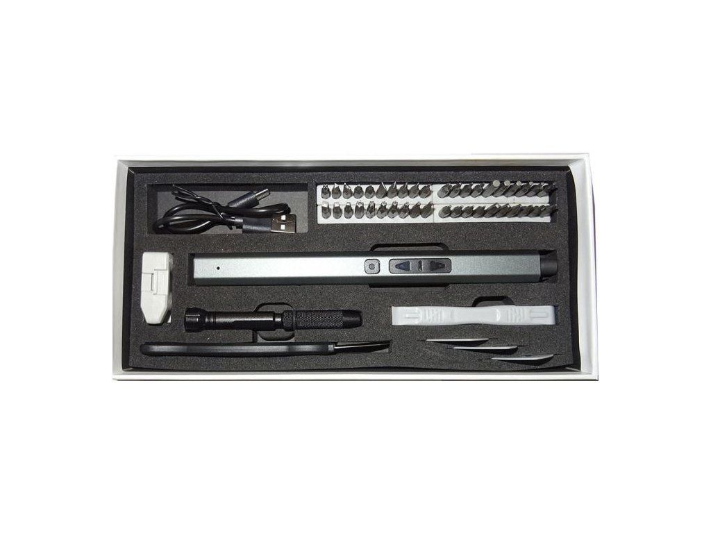 Aku šroubovák s 49ks příslušenství Akušroubovák s Li-Ion akumulátorem 3,7V 600mAh, obousměrným chodem a osvětlením.**Specifikace:**