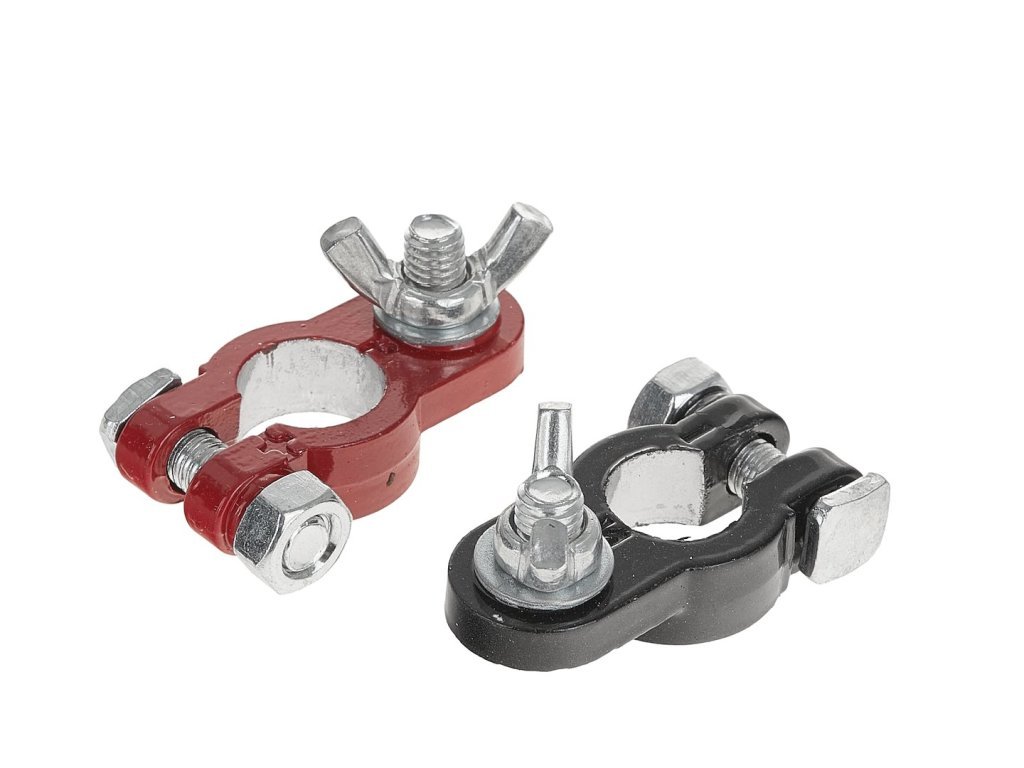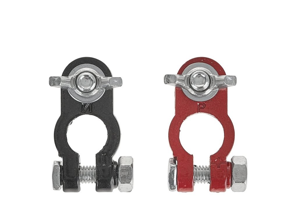 Akumulátorové hliníkové svorky G02406 zajistí spolehlivé připojení baterie ve vozidle. Jedná se o spolehlivou sadu skládající se ze dvou svorek: červené pro kladný pól (+) a černé pro záporný pól (-). Vhodné pro 6 V i 12 V baterie.