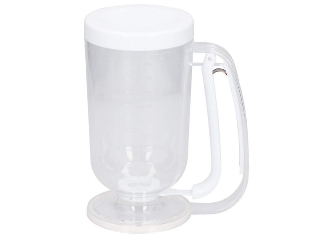 Tento dávkovač těsta od alpiny je vaším pomocníkem při pečení v kuchyni. Ideální pro přesné odměřování tenkého těsta, například na palačinky, muffiny a vafle. Dávkovací láhev má objem 900 ml. Stisknutím páky se z láhve na těsto stane stříkačka na těsto.Kapacita: 900mlRozměry: 10 x 20 cmDoplňkové parametry