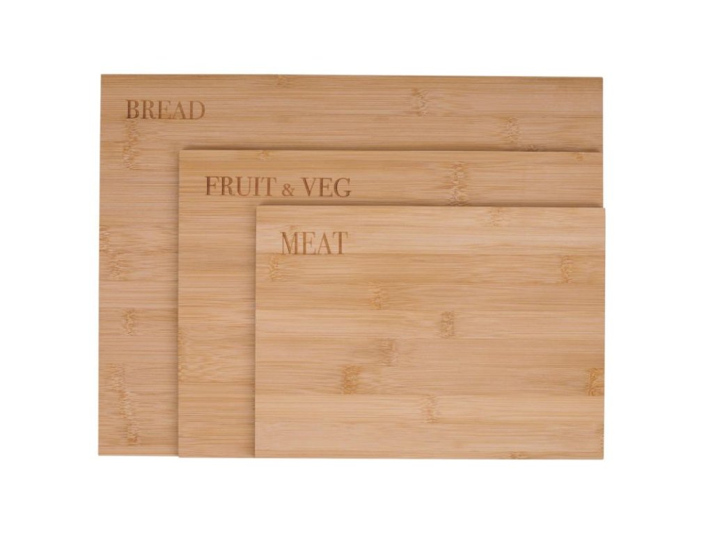 S touto sadou 3 dřevěných prkének od Alpiny máte vždy po ruce vhodné prkénko, např. servírovací prkénko nebo prkénko na chleba. Na dřevěných prkéncích je vyrytý text, konkrétně „maso“, „ovoce a zelenina“ a „chléb“. Sada prkének má 3 různé velikosti, takže budete mít vždy dobrou velikost po ruce. Materiálem je přírodní bambus, udržitelná volba pro vaši kuchyni. Dřevěná prkénka umývejte vždy ručně, abyste zabránili rozštípnutí.Sada obsahuje 3 ks: