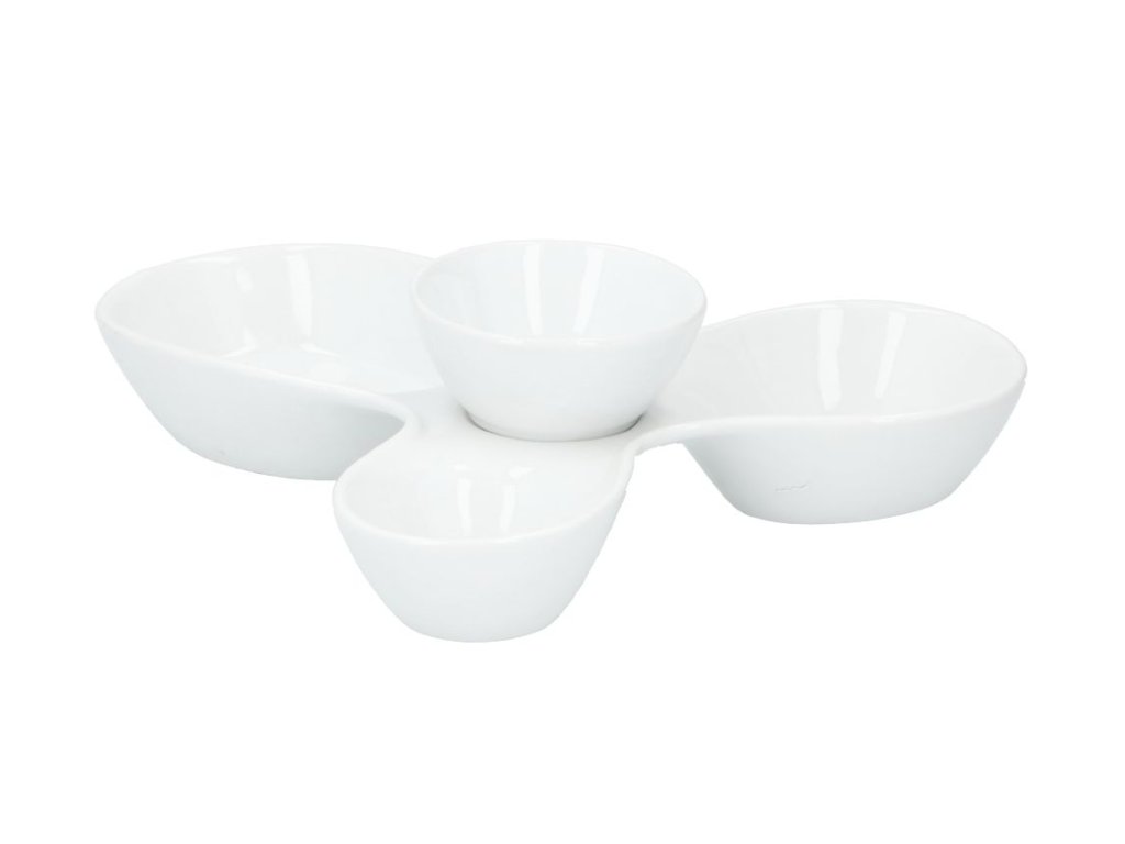 Miska na občerstvení je praktickým doplňkem při stolování. Hodí se na rodinné oslavy, setkání přátel a slavnostní večírky. Díky svému estetickému a funkčnímu designu perfektně doplní každý jídelní servis. Bude užitečná při servírování omáček, dipů a občerstvení, jako jsou olivy, cherry rajčata, nakrájené sýry. Rozměry: 24 x 22 x 7 cmObsah balení: 1x servírovací trojmiska 1x miska na omáčku.Doplňkové parametry