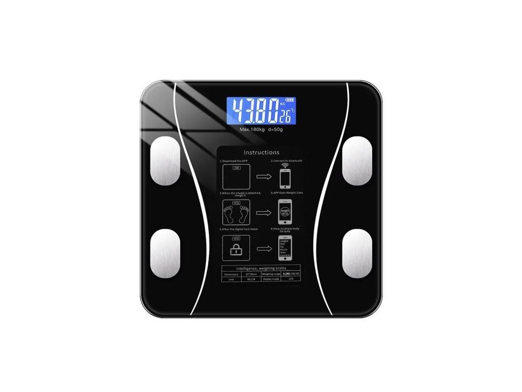 Přesná analytická váha 8 v 1 je profesionální zařízení, které kromě zobrazení hmotnosti a pokojové teploty také odesílá tělesné parametry přímo do našeho smartphonu díky čtyřem vestavěným senzorům a modulu Bluetooth. Analytická koupelnová váha poskytuje nejen aktuální tělesnou hmotnost, ale až 8 různých parametrů: poskytuje tělesnou hmotnost, počítá BMI, poskytuje denní kalorickou potřebu a umožňuje také měření svalové hmoty, tukové tkáně, množství vody v těla, kostní hmoty a také zajišťuje míru ukládání tuku ve vnitřních orgánech. Koupelnová váha s Bluetooth se bude hodit nejen lidem, kteří se snaží zhubnout, ale také sportovcům a všem, kterým na své postavě obzvlášť záleží.<BR/><BR/>SPECIFIKACE:<BR/><BR/> Černá barva<BR/> přípustná hmotnost měření: do 180 kg<BR/> napájení: 2 x AAA (součástí balení)<BR/> rozměry: 26 x 26 x 2,2 cm<BR/> hmotnost: 0,900 kg<BR/> hmotnost s obalem: 1 050 kg<BR/><BR/>Obsah balení:<BR/><BR/> Váha<BR/> 2 x AAA baterieDoplňkové parametry