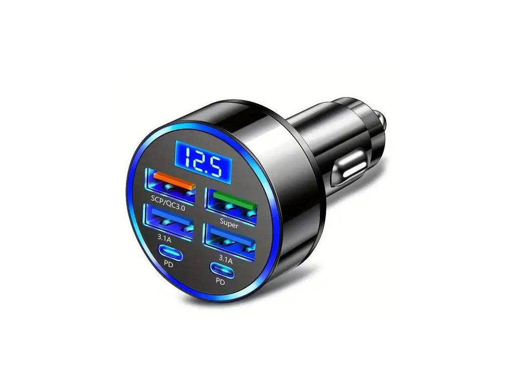 Autoadaptér USB 12V/5V s voltmetrem, 4x USB A+2x USB-C Univerzální adaptér pro napájení ze slotů USB doplněný voltmetrem pro kontrolu napětí v autozásuvce.**Specifikace:**