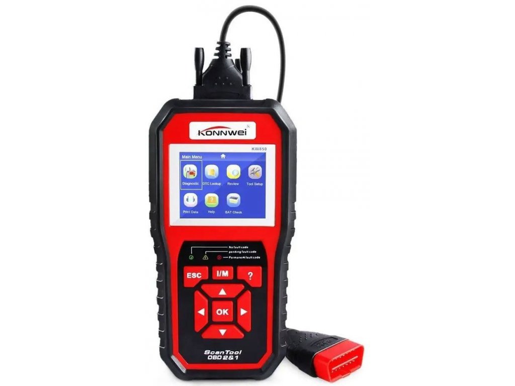 Ruční autodiagnostika Konwei KW850 umožňuje rychlou a přehlednou diagnostiku vašeho vozidla. Diagnostika umožňuje čtení a mazání chybových kódů (DTCs), Dokáže vypnout kontrolku upozorňující na kontrolu motoru (MIL) a určit poruchu. Zobrazuje živý přenos dat (například aktuální otáčky, napětí, rychlost, nebo třeba teplotu motoru). Kontrola poruchy týkající se emisí auta (Freeze Frame Data). Kontrola I/M připravenosti, která určuje, zdali auto vyhovuje americkým standardům emisí. Umožňuje získat identifikační číslo vozidla (VIN) a kalibrační čísla vozidla (CIN a CVN).Konnwei KW850 podporuje CAN a veškeré další současné OBD II protokoly, takže na ní můžete zkontrolovat většinu aut na trhu. Je schopna vymazat diagnostická chybová hlášení (DTCs) a vyresetovat OBD II status. Dokáže vypnout kontrolku vyzývající ke kontrole motoru (MIL) a určit, na jakou poruchu upozorňuje. Je také schopná získat identifikační číslo vozidla (VIN) a kalibrační čísla vozidla (CID a CVN). Nechybí ani živý přenos dat, v rámci kterého je schopna zobrazit například aktuální otáčky, napětí, rychlost, nebo třeba teplotu motoru. Můžete pomocí ní zkontrolovat poruchy týkající se emisí auta (Freeze Frame Data). Automechanikům se může hodit kontrola I/M připravenosti, která určuje, zdali auto vyhovuje americkým standardům emisí.