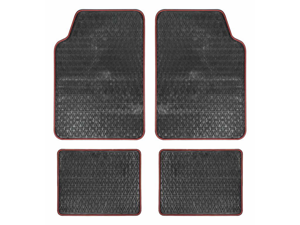 Sada 4 kusy (2x přední, 2x zadní díl), materiál guma, provedení černé s červenou linkou. Velikost předního koberce 68 x 48 cm, zadního 34 x 44 cm.