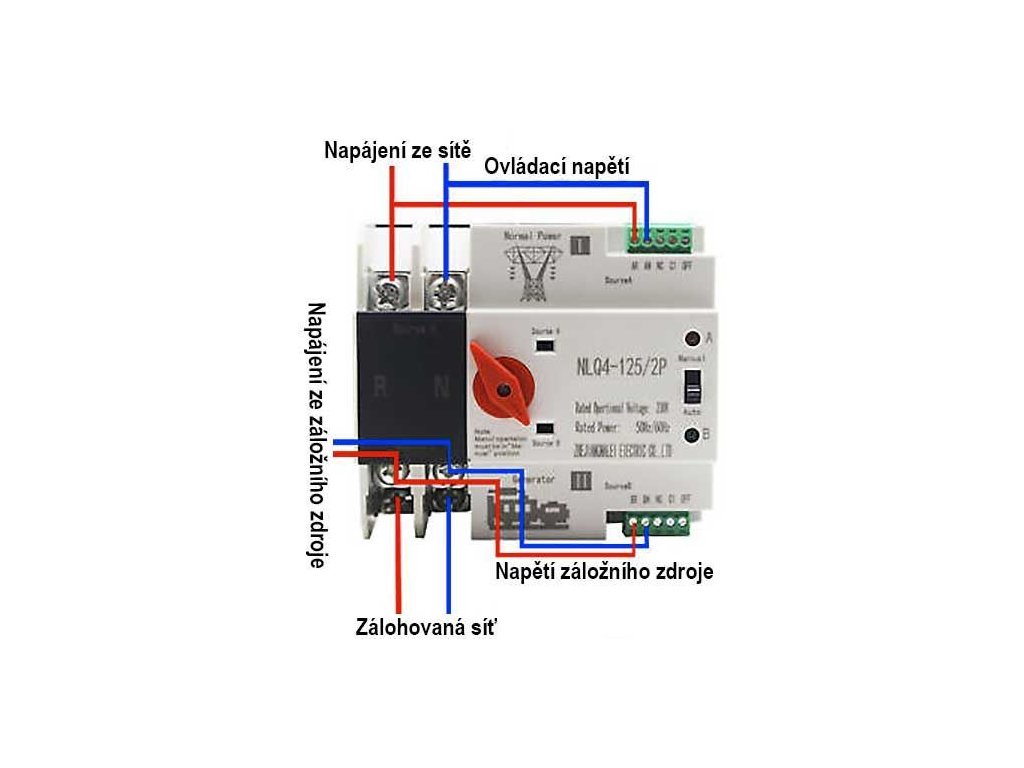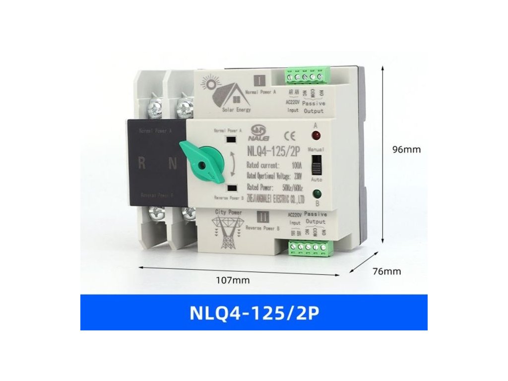 Automatický přepínač sítí - napájení 2P 230V 63A - NLQ4-125/2P pro FVE Přepínač sítí obsahuje pasivní silové kontakty s funkcí přepínače 2P a ovládací kontaky, které jsou určené pro ovládání zařízení v závislosti na přítomnosti síťového napětí. Přepínač sítí lze využít ik jiným účelům např. k připojování rozličných spotřebičů v závislosti na dostupnosti energie, např. ze solárních panelů.**FUNKCE OVLÁDÁNÍ:**