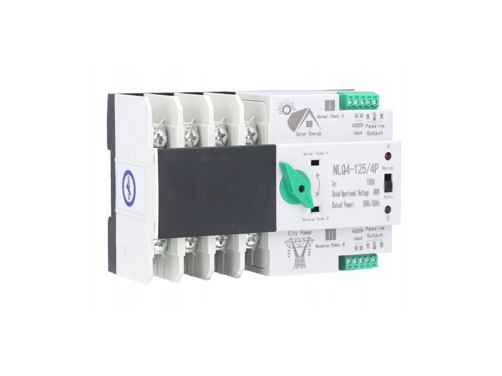 Automatický přepínač sítí - napájení 4P 400V 80A - NLQ4-125/4P pro FVE Přepínač sítí obsahuje pasivní silové kontakty s funkcí přepínače 4P a ovládací kontaky, které jsou určené pro ovládání zařízení v závislosti na přítomnosti síťového napětí. Přepínač sítí lze využít ik jiným účelům např. k připojování rozličných spotřebičů v závislosti na dostupnosti energie, např. ze solárních panelů.**FUNKCE OVLÁDÁNÍ:**