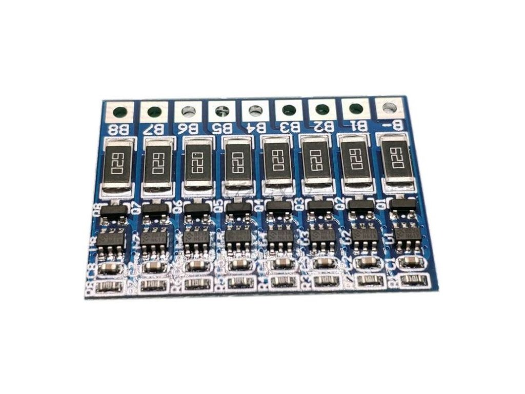 Balancér pro Li-Ion články s nabíjecím napětím 4,2V. Pokud svorkové napětí článku dosáhne 4,2V, začne balancér článek vybíjet proudem 66mA. Takto lze zajistit nabíjení článků, které ještě nedosáhly stavu plného nabití, tzn. jejich svorkové napětí ještě nedosahuje 4,2V. Tímto modulem lze balancovat 2-8článků.**Zapojení 8S:**