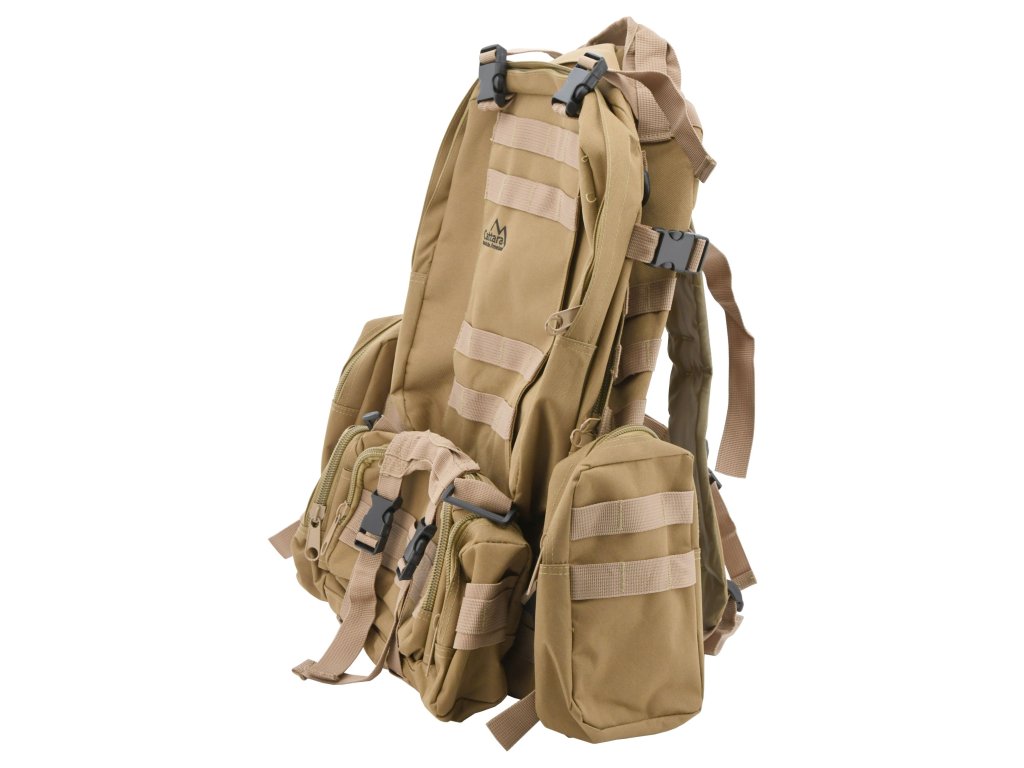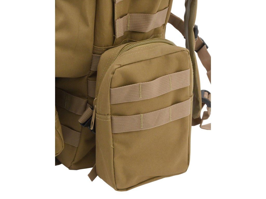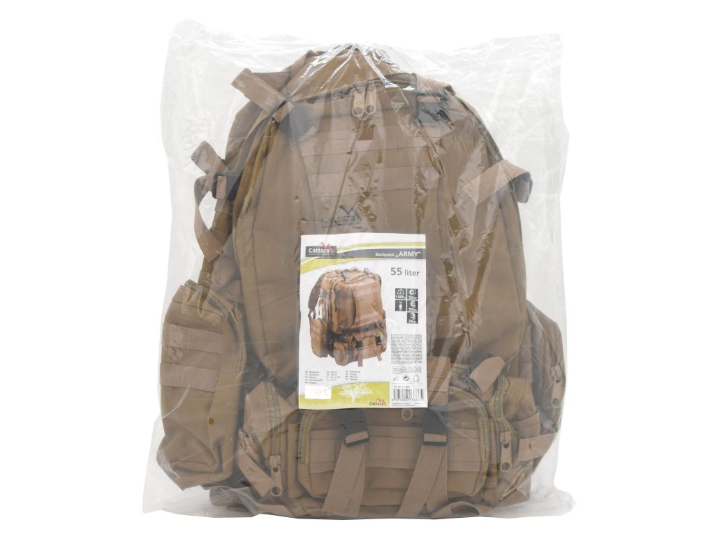 Zhotovení ze 100% polyesteru s voděodolnou PVC vrstvou z vnitřní strany. Batoh má rozměry 50 x 52 x 26 cm a nabízí objemný prostor až pro 55L předmětů. Na čelní straně a na bocích je doplněný o sumky, které lze jednoduše sundat, či umístit na jiné místo s Molle vazbou.