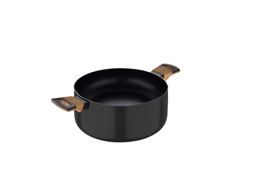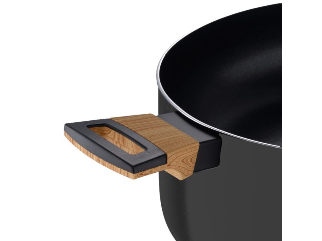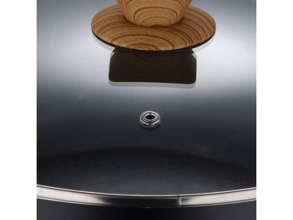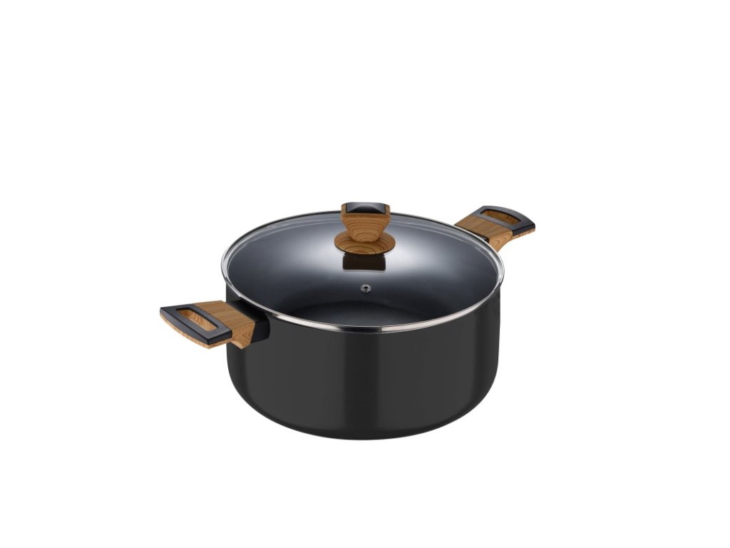 •28 cm hrnec se skleněnou poklicí. •Vyrobeno z lisovaného hliníku pro rychlý nárůst teploty.•Nepřilnavý povrch ILAG Premium v černé barvě.•Indukce s voštinovými vložkami, vhodná pro všechny druhy tepla.•Žáruvzdorné dřevěné rukojeti Soft Touch.•Doporučujeme ruční čištění.Hrnec 28 cm se skleněnou poklicí z kolekce Bergner´s Earth Black je vyroben z lisovaného hliníku a zaručuje rychlý rozvod tepla. Prémiový nepřilnavý povlak ILAG je obzvláště odolný a vhodný pro každodenní použití. Vzhledem ke složení materiálu je při vaření v tomto kastrolu bez PFOA, olova nebo kadmia nutné použít pouze malé množství tuku, perfektní pro zdravé vaření. Ergonomická dřevěná rukojeť s měkkým úchopem a tepelně odolná proti popálení. Základna s indukčním bodem je vhodná pro všechny sporáky jako je indukční, plynový, sklokeramický, halogenový a elektrický. Snadno se čistí, na povrchu se nelepí potraviny a pro prodloužení životnosti výrobku se doporučuje ruční mytí.Doplňkové parametry
