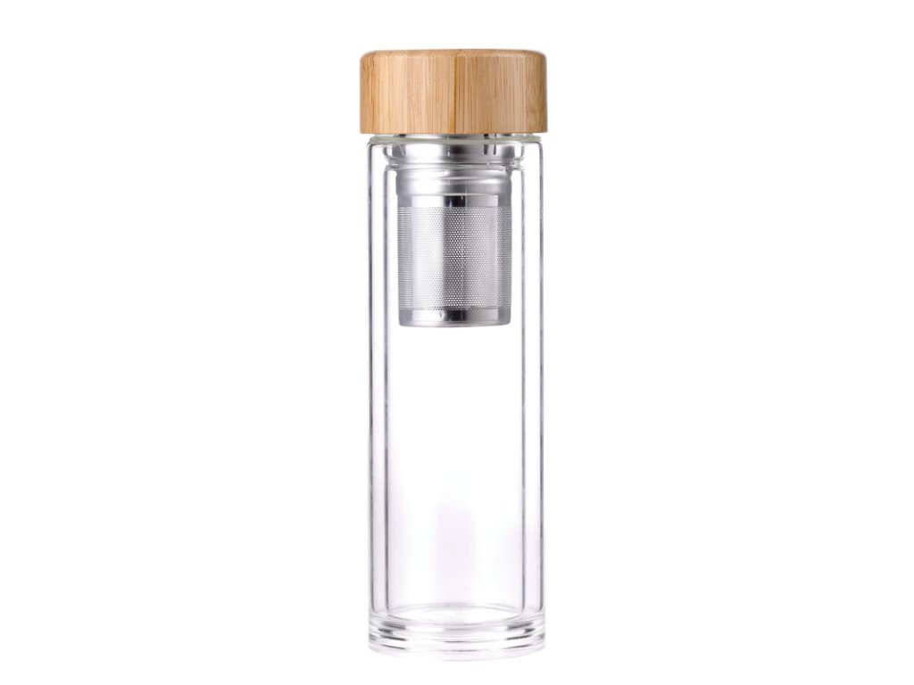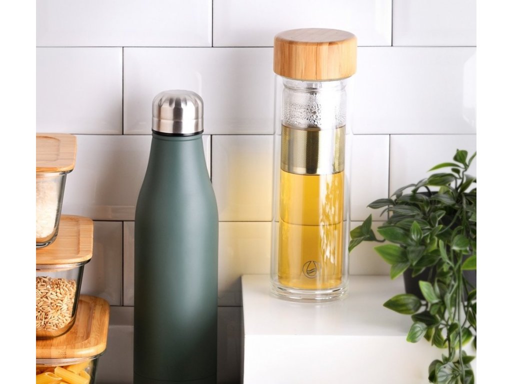 - přenosná lahev na vodu, limonádu i čaj z borosilikátového skla- toto žáruvzdorné sklo dobře snáší studené i teplé nápoje a jejich teplotu udržuje mnohem lépe než plast- lahev má navíc dvojitou stěnu a teplotu nápoje tak dokáže udržet i 4 až 8 hodin- termolahve z borosilikátového skla jsou samozřejmě o dost zdravější než plastové- spolehlivé uzavření díky šroubovacímu víčku z bambusového dřeva- víčko má silikonové těsnění, láhev tak neprotéká v žádné poloze- díky velkému hrdlu jednoduše přidáte ovoce, led i bylinky do Vašeho oblíbeného nápoje- nerezové odnímatelné sítko Vám luhování surovin významně usnadní- snadné čištění, vhodné do myčky nádobí- objem: 0,35 litruDoplňkové parametry