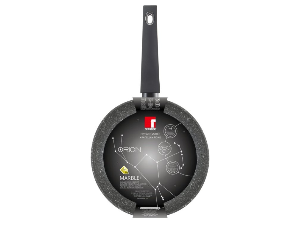 Pánev z kolekce Orion od Bergnera je ideální pro přípravu jakéhokoli typu receptu pro dvě nebo více osob. Vyrobena z kovaného hliníku, který umožňuje rychlou a rovnoměrnou distribuci tepla, zabraňuje vzniku horkých míst a šetří energii. Nepřilnavá vnitřní vrstva Marble+ zajišťuje, že se jídlo nelepí na povrch a usnadňuje čištění. Pánev je vhodná pro všechny typy sporáků včetně indukce.