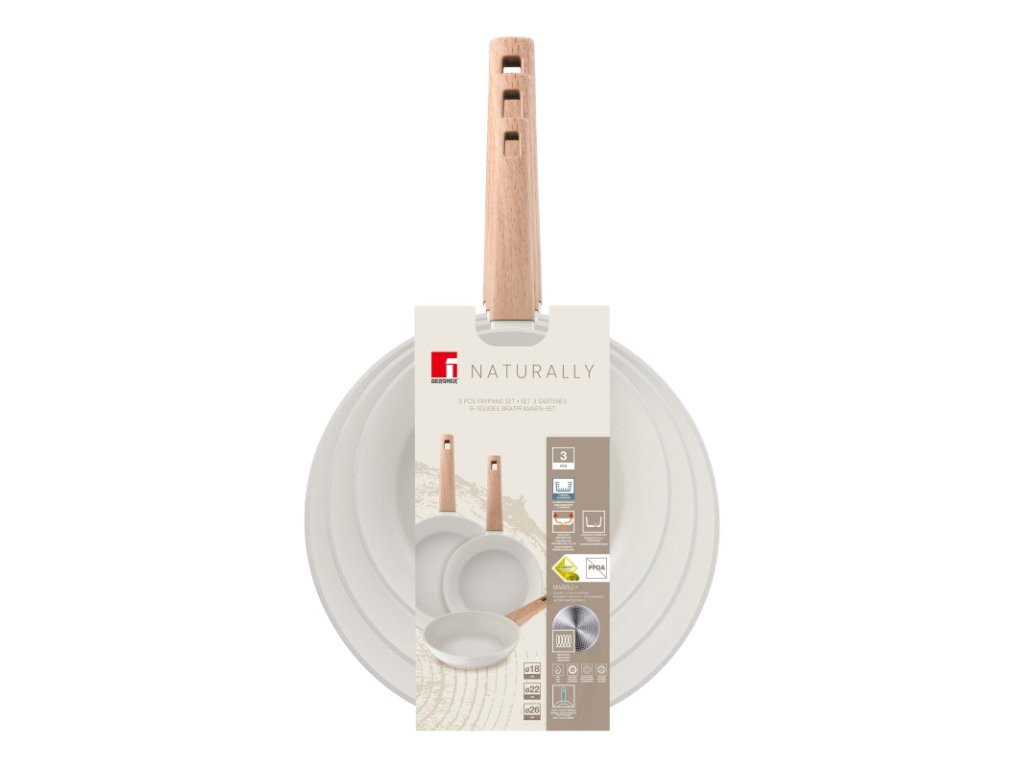 Tato sada obsahuje tři pánve o průměrech 18 cm, 22 cm a 26 cm, které jsou vyrobeny z kovaného hliníku a opatřeny vysoce kvalitním nepřilnavým povrchem Marble+. Součástí sady jsou také ergonomické rukojeti s měkkým povrchem pro pohodlný úchop.