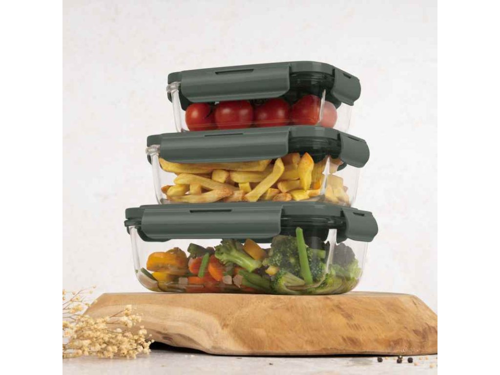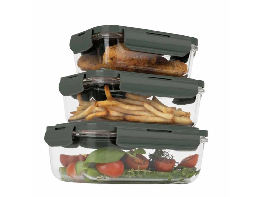 Elegantní a praktická sada nádob na skladování potravin z odolného borosilikátového skla.