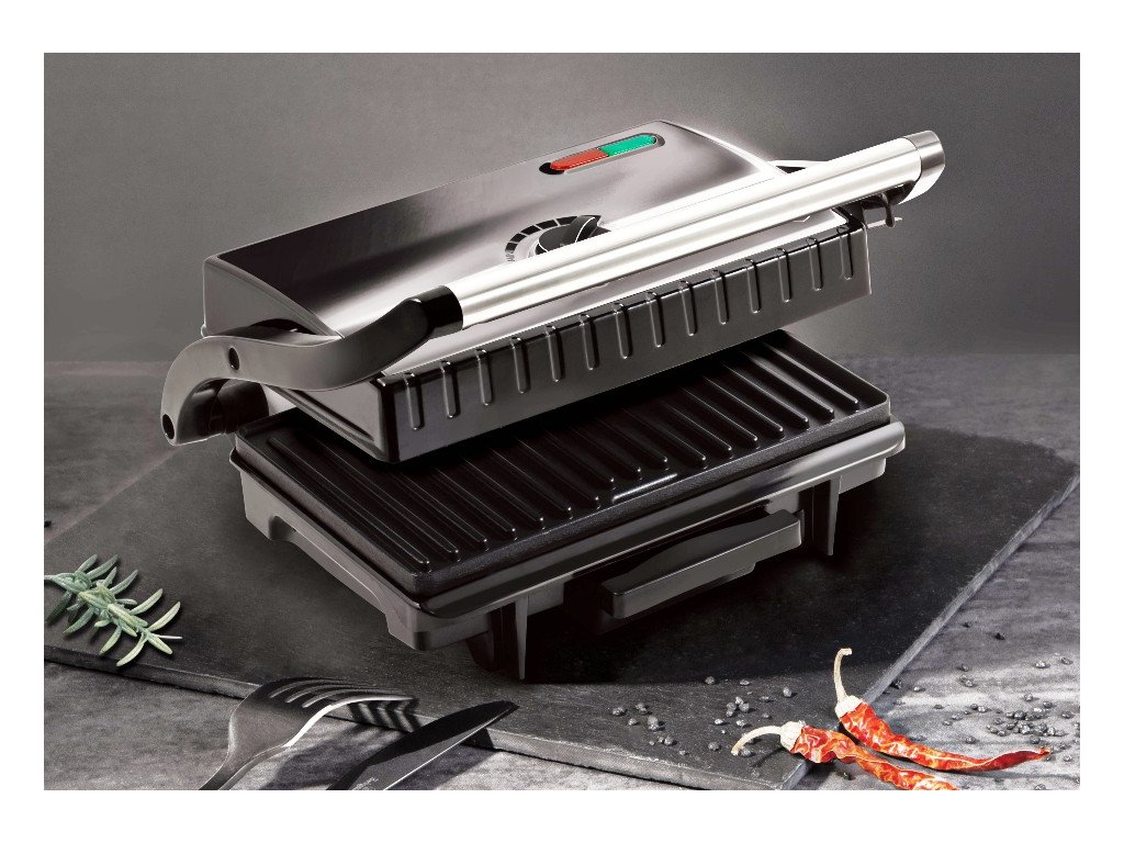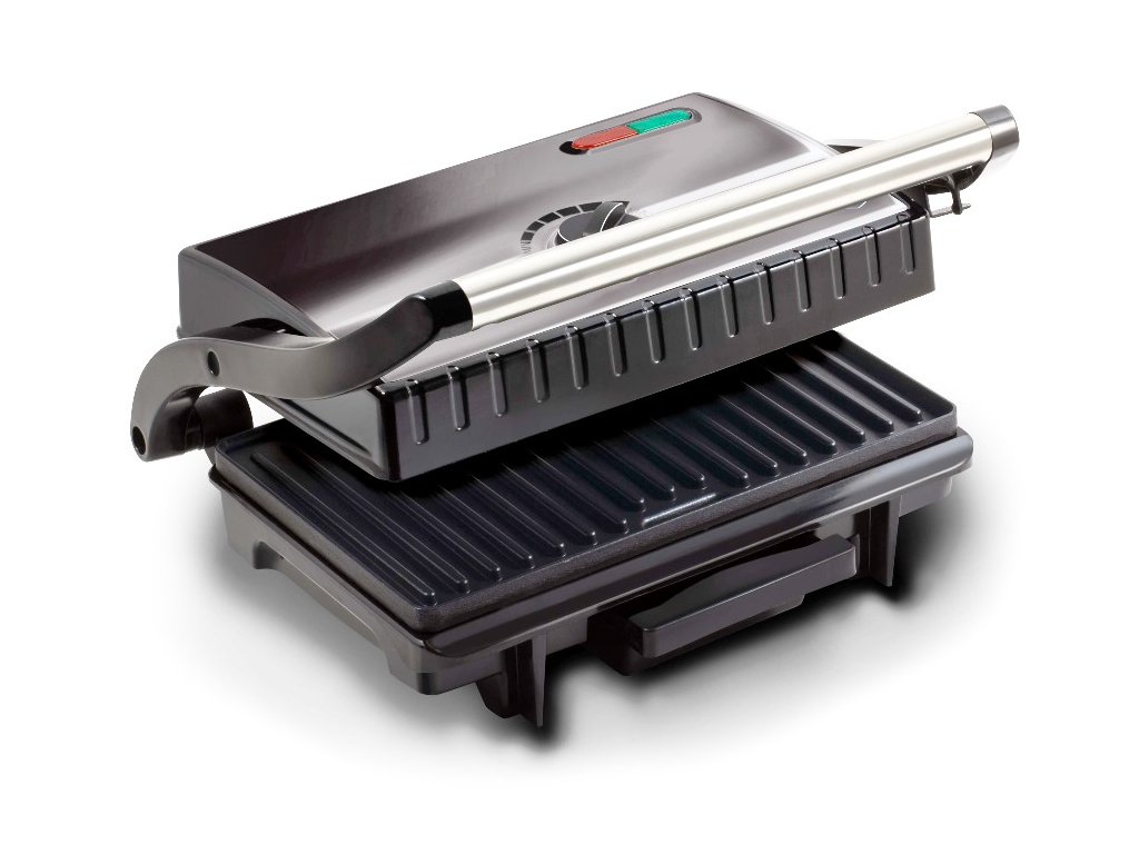 - elektrický domácí kontaktní gril z nerezové oceli- flexibilní použití, skvěle kombinuje stolní gril pro přípravu masa a panini gril na přípravu baget a sendvičů
