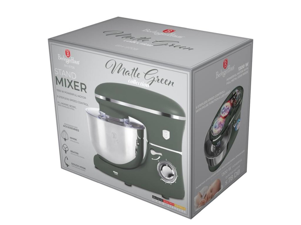 Kuchyňský robot Berlinger Haus BH/9708 Matte Green je ideální volbou pro každodenní použití v kuchyni. Díky kapacitě 6 litrů a výkonu 1300 W si snadno poradí s přípravou těsta, šleháním a mícháním. Robot je vybaven nerezovou mísou, hákem na těsto, šlehačem a metlou, což zajišťuje všestrannost při vaření a pečení. Elegantní matná zelená barva a moderní design dělají z tohoto kuchyňského robota stylový doplněk do každé kuchyně.