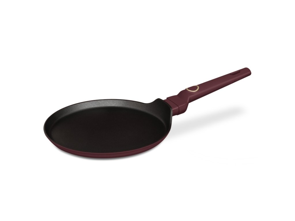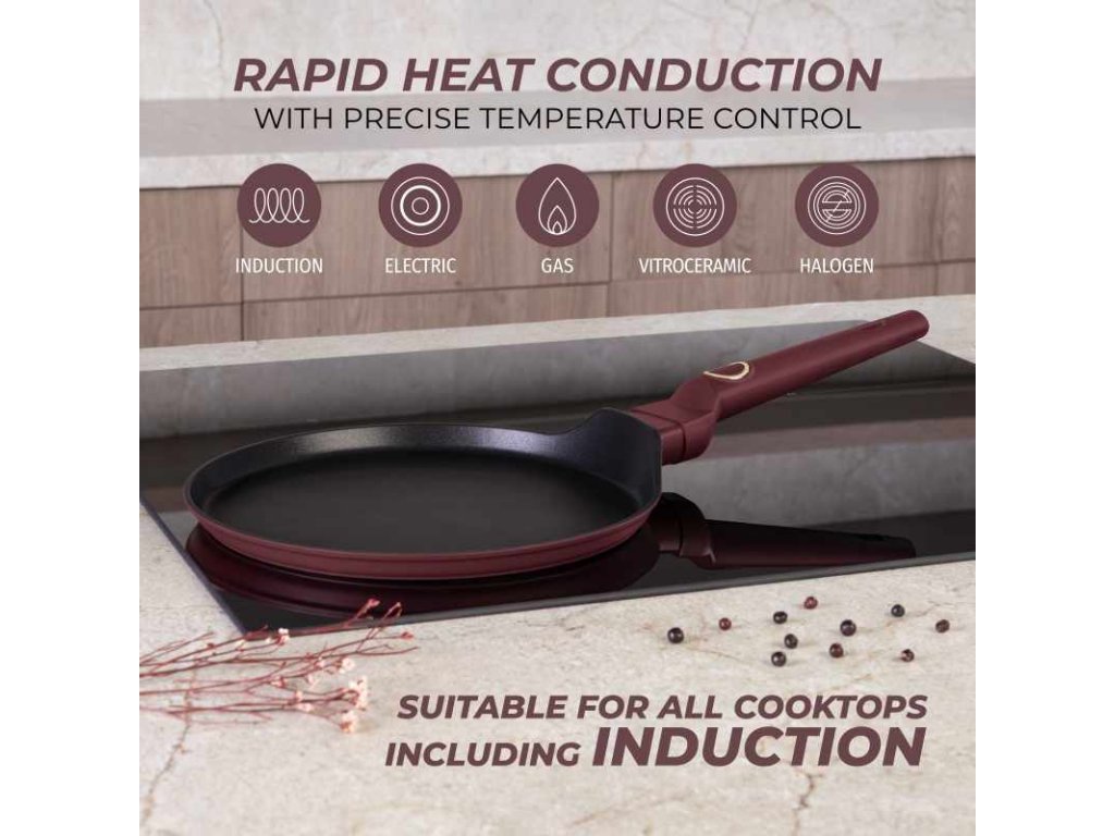 Pánev na palačinky s titanovým povrchem v matném červeném bordeaux designu Leonardo Collection. Moderní minimalistický design pánve vás jistě zaujme hned na první pohled. Matný bordeaux povrch pánve je navíc velmi praktický při dlouhodobém používání. Vnitřní vrstva je potažena 3vrstvým titanovým povrchem, který je charakteristický svou dokonalou nepřilnavostí. Připravované pokrmy se tak nepřipalují a díky tomu se pánev velmi snadno čistí. Zároveň je vhodný pro zdravé vaření s minimem tuku nebo oleje, v závislosti na použitých surovinách klidně i bez jedinné kapky tuku. Titanový povrch, stejně jako ostatní použité materiály, neobsahují žádné škodlivé látky, vaření je tak zcela zdravé a hygienické. Zesílené Turbo indukční dno z nerezové oceli je kompatibilní se všemi druhy varných desek a spolehlivě funguje také na indukci. Jistě oceníte tepelně izolovanou rukojeť, která se při vaření nezahřívá a zůstává stále chladná. Pánev Leonardo je vhodná pro každodenní vaření, dušení i smažení, perfektně bude vypadat i při servírování hotových jídel přímo na váš stůl.- vnitřní i vnější vrstva neobsahují žádné škodliviny, výsledné pokrmy tak neztrácí vařením svoje vitamíny