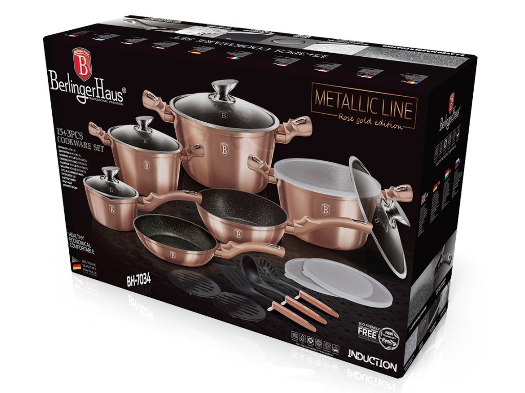 Hledáte vhodnou sadu nádobí do vaší kuchyně? Sadou získáte všechny potřebné nádoby na vaření, ať už budete vařit pro sebe nebo pro více osob. Velkou výhodou je, že můžete objednat najednou více nádobí od ověřeného výrobce BERLINGERHAUS. Sadu nádobí sjednocuje jednotný design, navíc zlatá barva celé sady je univerzální a vyjímat se bude v každé kuchyni.