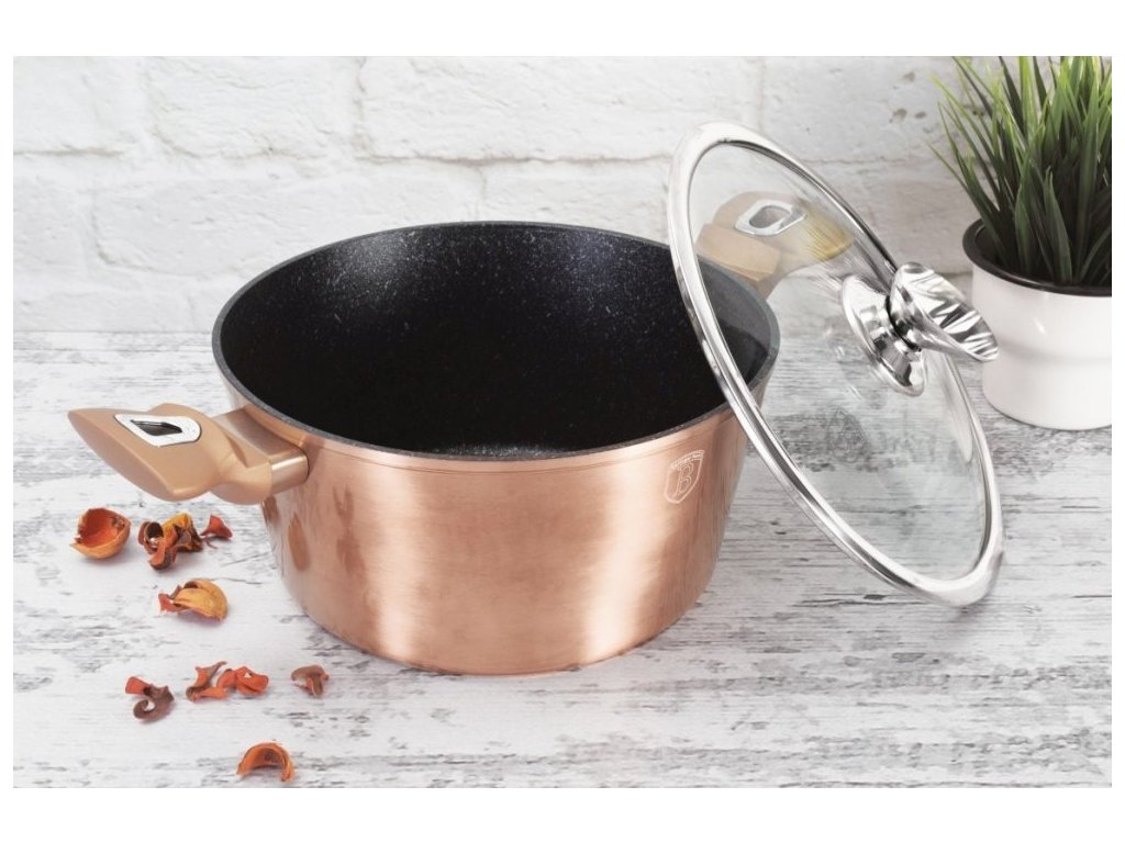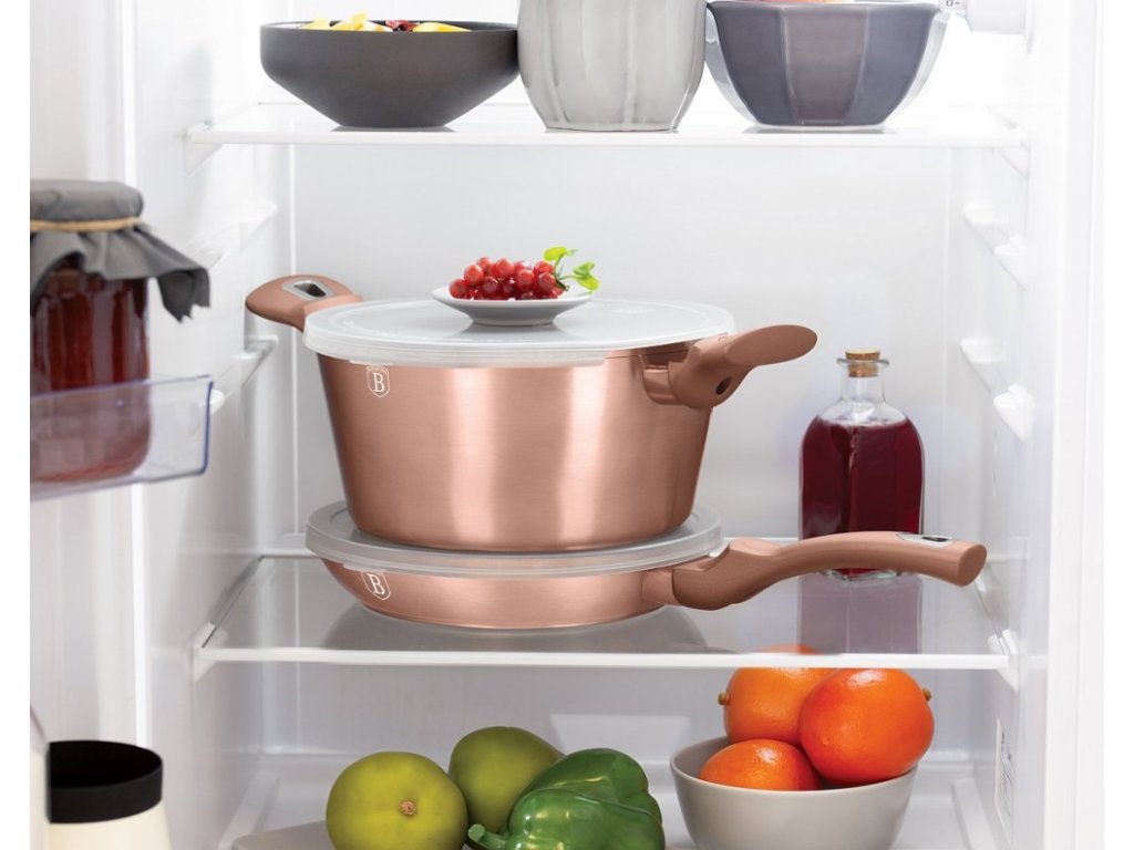 Bohatě vybavená sada nádobí z metalické rosegold kolekce zaujme nejen nepřehlédnutelným moderním designem, ale především svými jedinečnými vlastnostmi. V sadě jsou navíc 3 praktická víčka, kterými lze nádoby uzavřít.- doménou této sady je 3vrstvý povrch s mramorovým designem charakteristický svou dokonalou nepřilnavostí, žádné potraviny se nepřipalují a díky tomu se kastroly i pánve velice snadno čistí