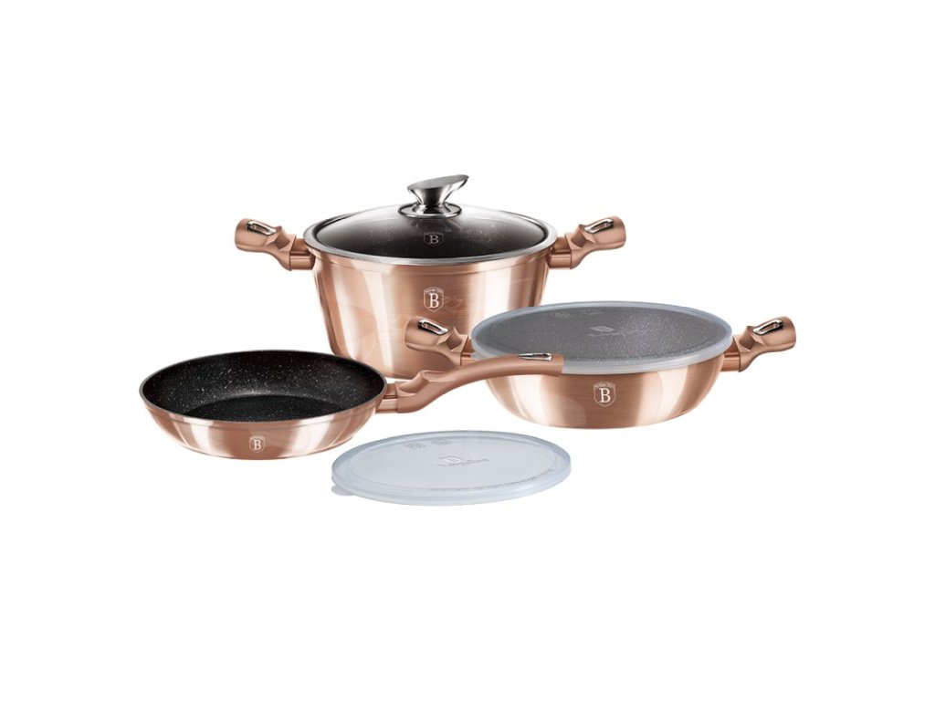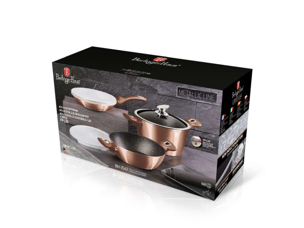 - základní sada nádobí z oblíbené kolekce Rosegold Metallic v unikátní metalické barvě- doménou této sady je 3vrstvý nepřilnavý povrch s mramorovým designem, charakteristický dokonalou nepřilnavostí, žádné potraviny se nepřipalují a díky tomu se kastroly i pánve velice snadno čistí