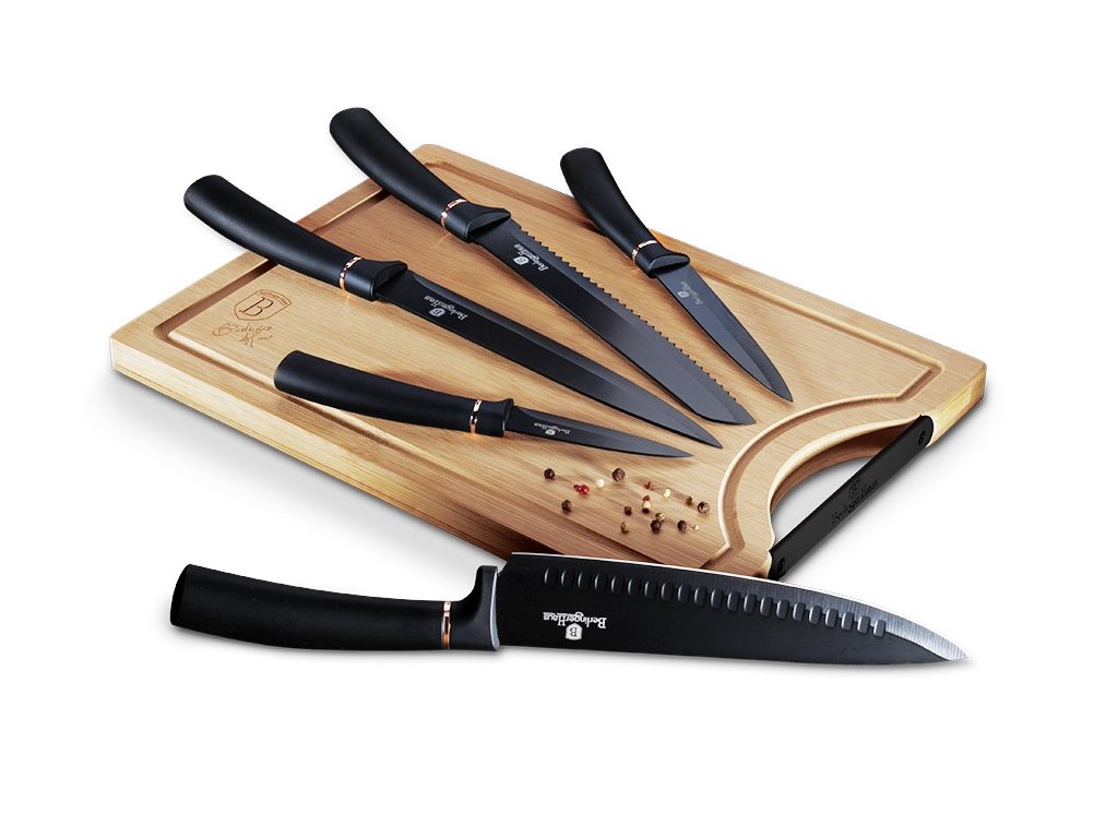 Prakticky vybavená sada nožů z kolekce Black Rose. V sadě najdete 5 nejpoužívanějších kuchyňských nožů a navíc velké bambusové prkénko s logem značky. Nerezové nože jsou potaženy nepřilnavým antibakteriálním povrchem, který je šetrný k potravinám, navíc se při krájení na nože nic nelepí. Ergonomicky tvarovaná rukojeť má na dotek měkčený povrch, který je protiskluzový, nůž se v ruce velmi pohodlně drží a neklouže. Prkénko z bambusového dřeva s drážkou pro odtékání šťáv lze pohodlně vzít za rukojeť a krájené potraviny přemístit rovnou do hrnce.- materiál: nerezová ocel s nepřilnavým povrchem