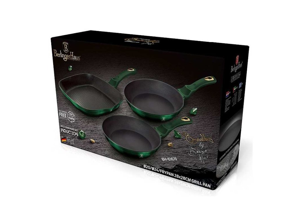 - Třídílná sada pánví z kolekce Emerald zaujme nejen nepřehlédnutelným moderním designem a unikátní smaragdovou barvou, ale především svými jedinečnými vlastnostmi- doménou této sady je 3vrstvý nepřilnavý titanový povrch charakteristický svou dokonalou nepřilnavostí, žádné potraviny se nepřipalují a díky tomu se kastroly i pánve velice snadno čistí