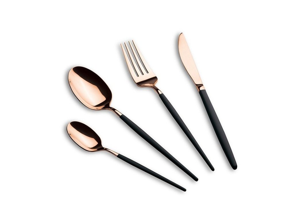 Tato sada příborů je vyrobena z vysoce kvalitní nerezové oceli s PVD povlakem z růžového zlata a matně černou rukojetí. Sada obsahuje 6 stolních nožů (7,0 mm), 6 stolních vidliček (4,0 mm), 6 kuchyňských lžic (4,0 mm) a 6 čajových lžiček (2,7 mm). Elegantní design s matně černou rukojetí a zrcadlovou úpravou dodává příborům moderní vzhled, který se hodí do každé kuchyně.