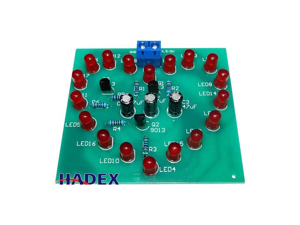 Blikající srdce, STAVEBNICE Jednoduchá stavebnice blikajícího srdce s 18x LED. Napájení 4,5-5V, rozměry DPS 68x60mmManuál k produktu je ke stažení zde