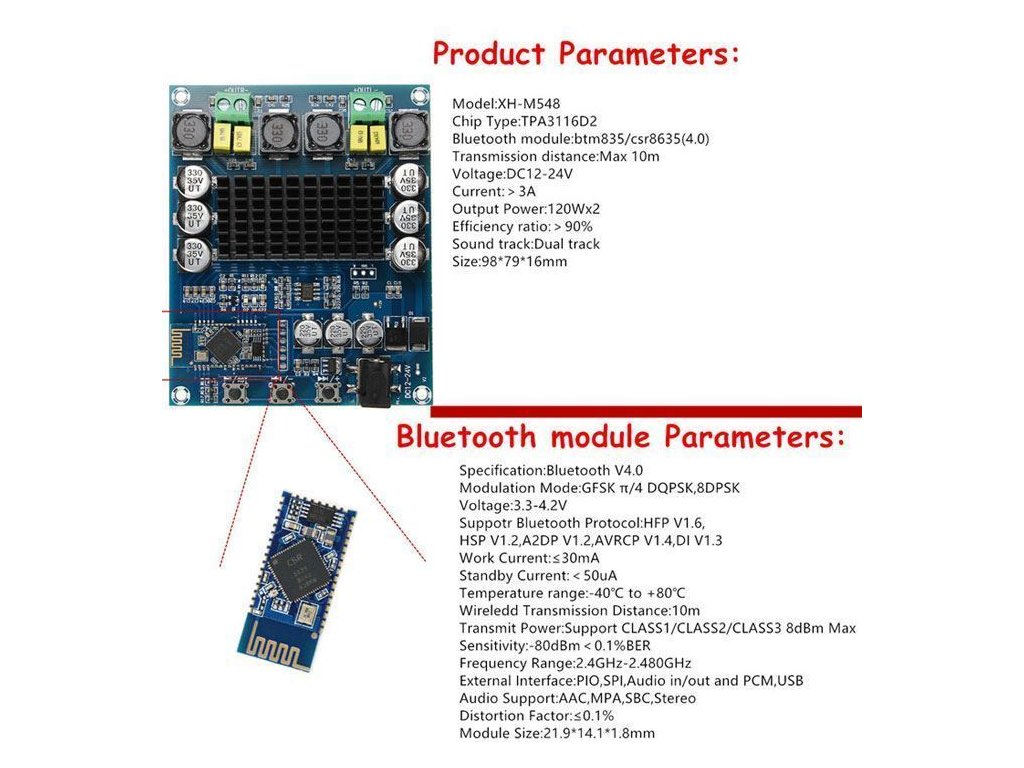 Bluetooth přijímač a zesilovač 2x120W, modul XH-M548 Modul přijímače bluetooth 4.0 s nf zesilovačem 2x120W pro všestranné použití**Specifikace:**