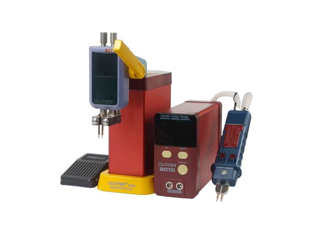 Bodová svářečka baterií GLITTER 801D s příslušenstvím, 14,5kW GLITTER 801D je kondenzátorová bodová svářečka pro bodové svařování akumulátorů do bateriových akupacků pomocí niklových plíšků. Ke stanici lze připojit svařovací pero nebo integrované rameno. Oprotiklasickým svářečkám s transformátorem nabízí nižší hmotnost i rozměry a větší energii pulsu. Svářečka umožňuje i svařování niklových pásků na hliníkový podklad. Svářečka se aktivuje 0-20ms po přiložení hrotů k plíškům.**Specifikace:**