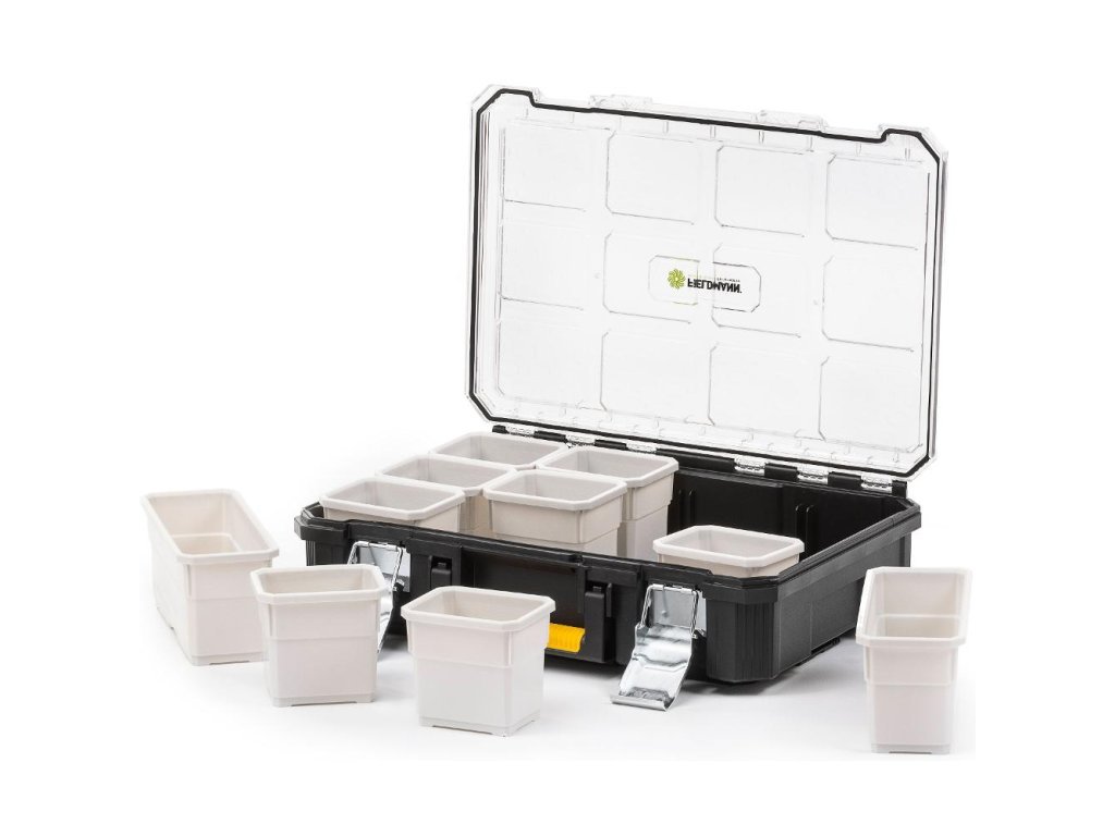 Box na nářadí je vyroben z pevného plastu s vysokou odolností proti vodě, prachu a nárazům, což poskytuje bezpečnou ochranu uloženému materiálu. Pro pohodlné přenášení slouží postranní madlo a bezpečné uzavření zajistí kovový zámek.