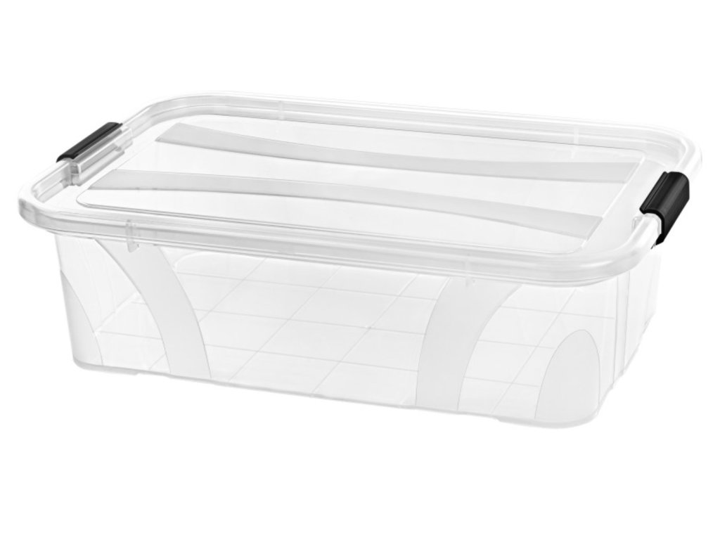 Kvalitní plastová čirá dóza s čirým víkem, černé klipy na uzavření víka.Boxy je možné stohovat na sebe a ušetřit tak prostor.