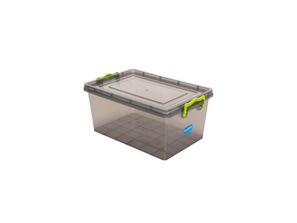 Krabice s víkem vyrobená ze zakouřeného plastu.Objem 55 litrů, rozměry 58.6 x 39 x v.35.5 cm.