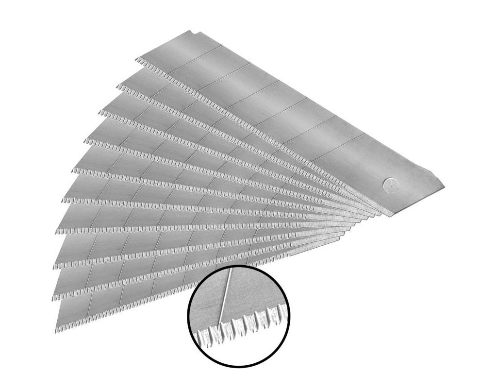 - tvrdý ulamovací břit o tloušťce 0,7mm je vyroben z materiálu SK5 a opatřen zoubkovým ostřím, které pomáhá při řezání plastů, pryže, sendvičových materiálů na bázi dřeva a tvrzeného papíru případně lepenek atd.