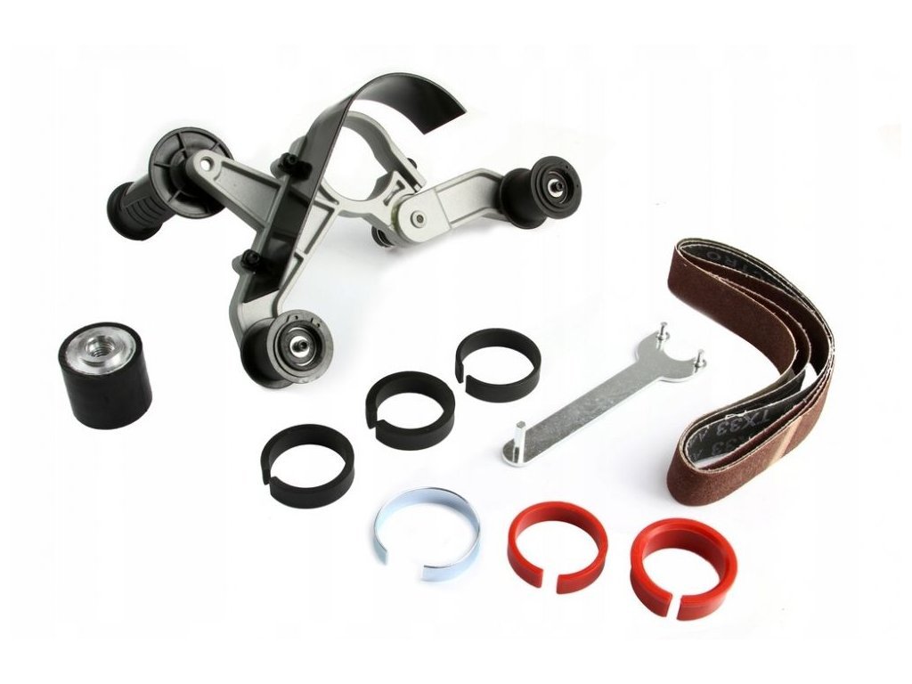 Nástavec pro úhlovou brusku nahradí pásovou brusku na trubky. Používá se k renovaci, satinaci, ale i hrubému broušení trubek, uzávěrů, koncovek, zábradlí a další zaoblené dřevěné a kovové povrchy.