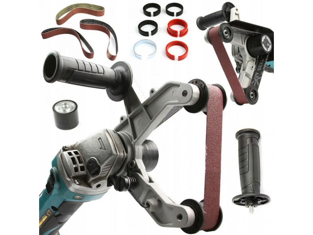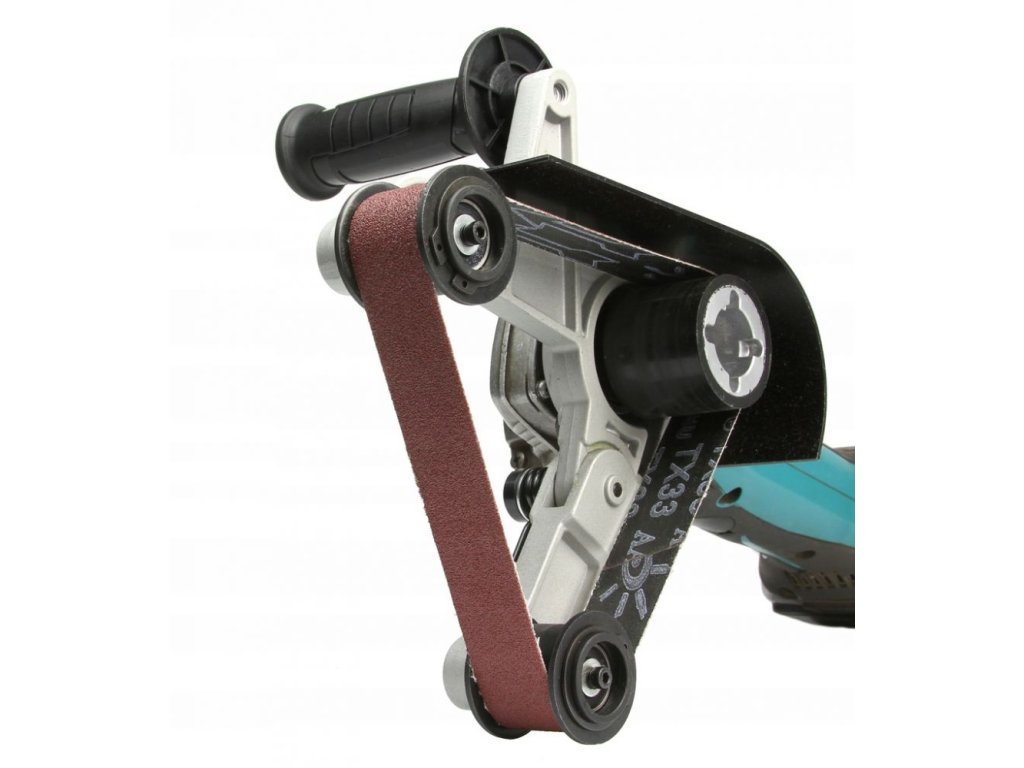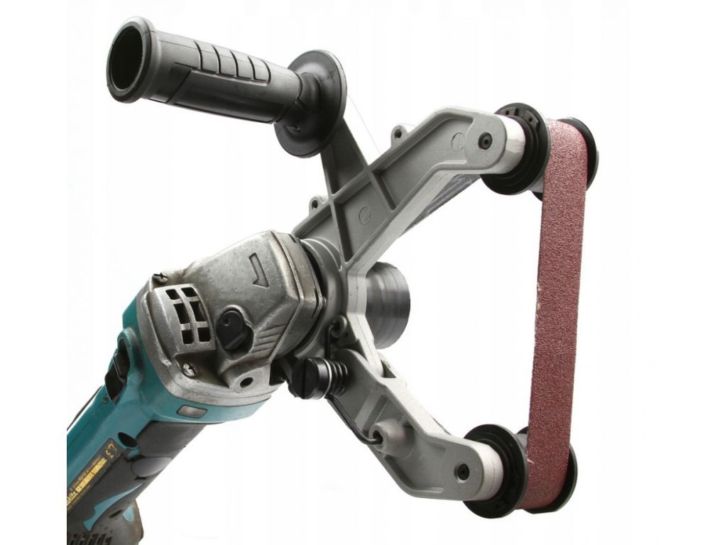 Nástavec lze použít na většinu úhlových brusek se závitem M14. Upnutí nástavce je snadné a rychlé. Maximální brusný úhel 270° zajišťuje obrábění i velmi malých součástek. Pružné napínací rameno zajistí plošné broušení kulatých předmětů různých rozměrů. Rukojeť zajišťuje snadnější a komfortnější práci. Výměna brusného pásu je také velmi jednoduchá a rychlá. Obrábění předmětů s průměrem cca od 12 do 180 mm.