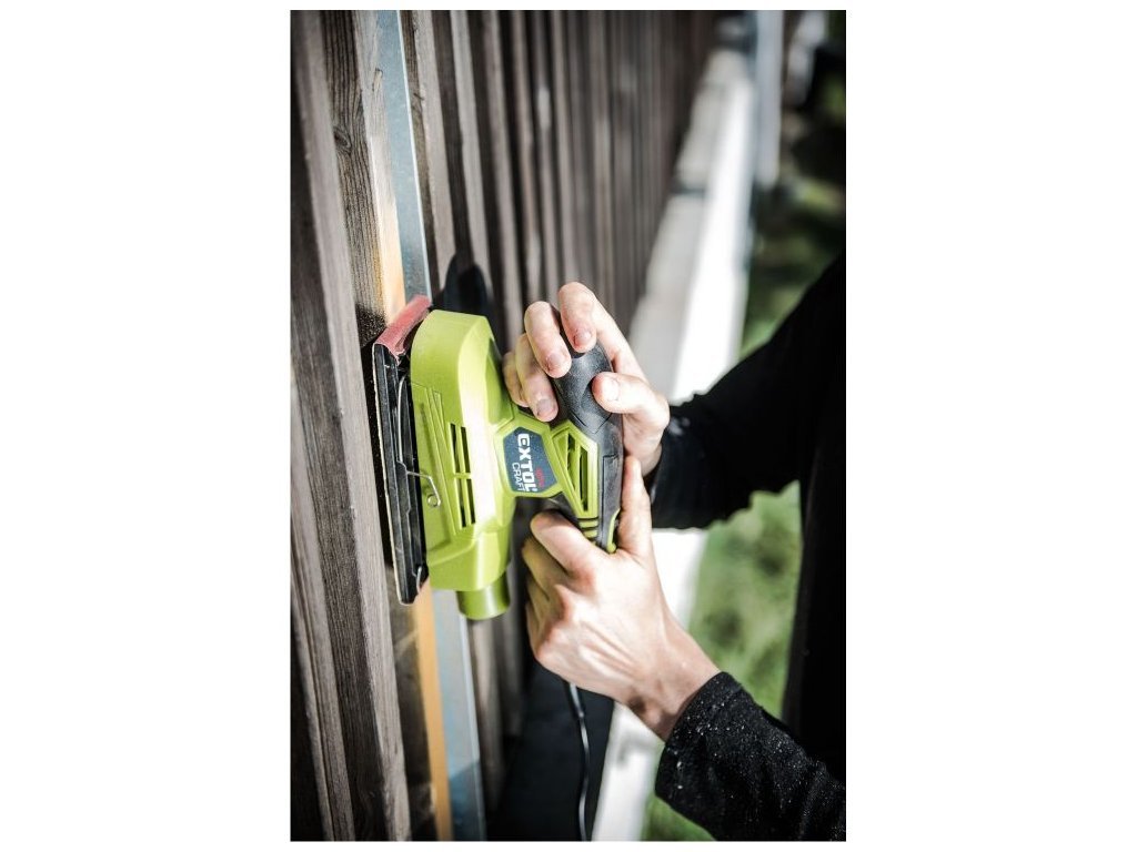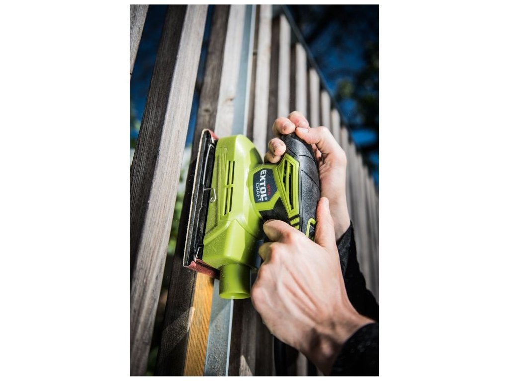 Dvouruční bruska určena pro broušení dřeva a dřevěných materiálů, kovů a zabroušení poškozených míst povrchové úpravy, např. barvy a laku, dále tmelů apod. bez použití vody. Broušení je prováděno mikrojemnými vibracemi brusné základny kmitající o vysoké frekvenci. Bruska je vhodná pro broušení v místech s pravým úhlem, např. v rozích podlah a k finálnímu zbroušení jemných defektů na površích před nanášením povrchové úpravy. Bruska není určena k broušení sádrokartonu a stavebních materiálů.