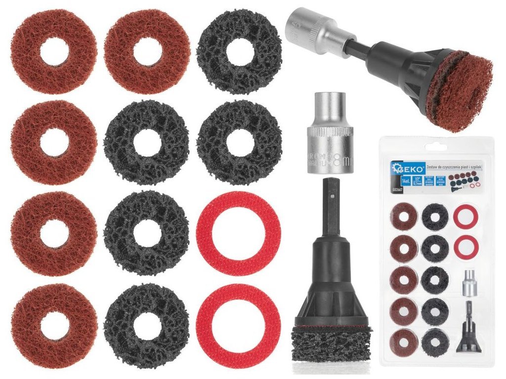 Brusné kotouče na náboje kol v sadě 14 ks. Pro rychlé a snadné odstranění rzi a nečistot z nábojů kol a brzdových kotoučů.