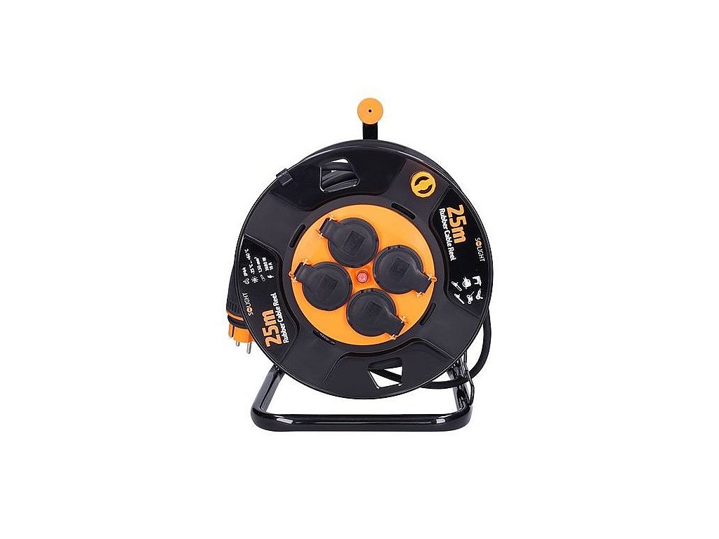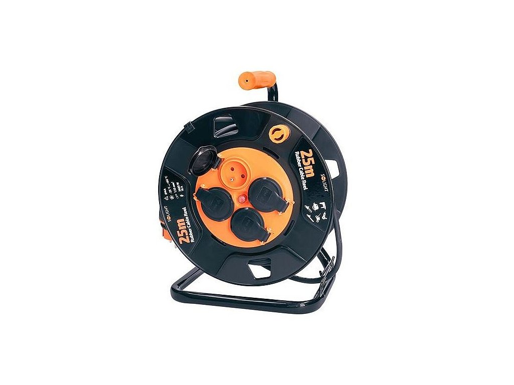 25m gumový kabel na bubnu z odolného plastu a čtyřmi zásuvkami je ideální pro použití venku, na zahradách, stavbách nebo v dílnách. Bytelná konstrukce s krytými zásuvkami i kabel samotný jsou odolné proti povětrnostním podmínkám a mechanickému namáhání.