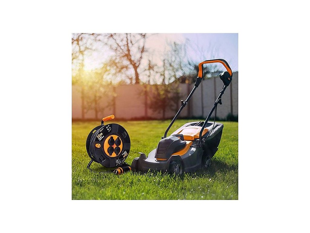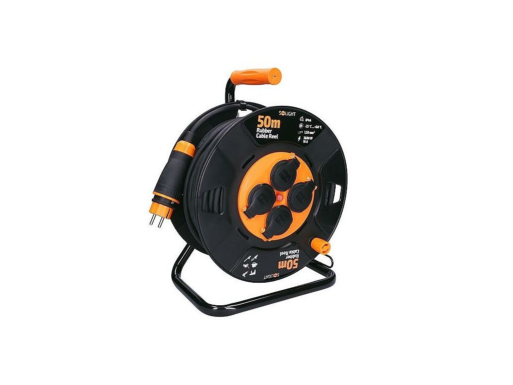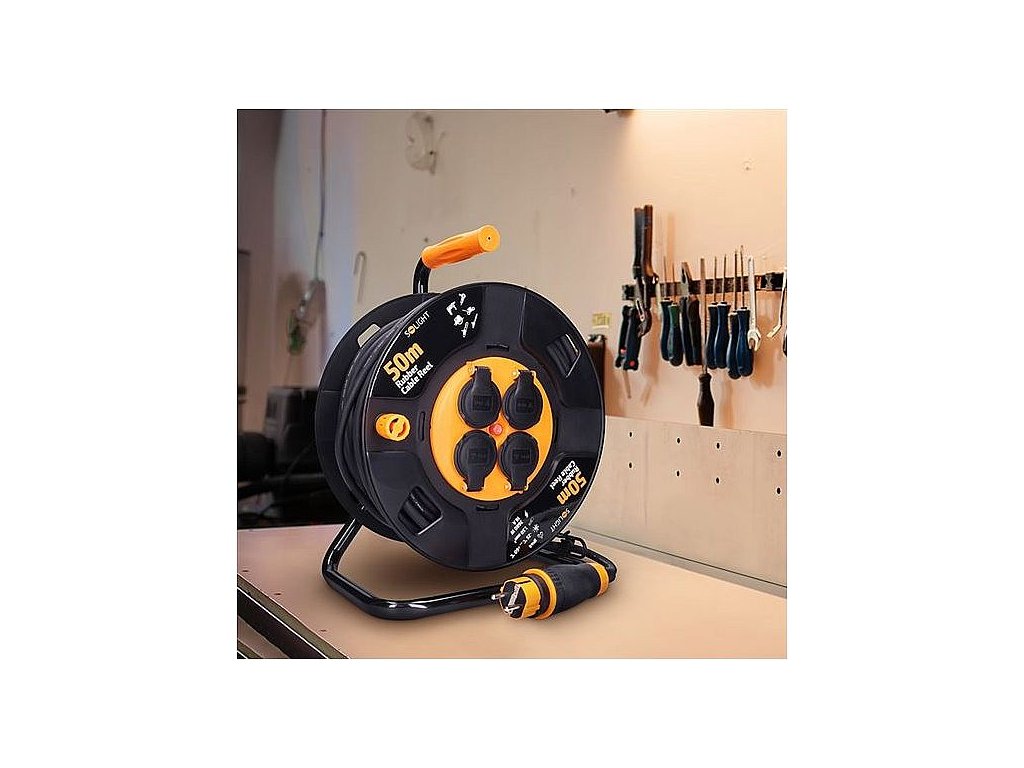 Prodlužovací kabel na navíjecím bubnu s délkou 50 metrů a čtyřmi zásuvkami je ideální pro použití venku, na stavbách nebo v dílnách.