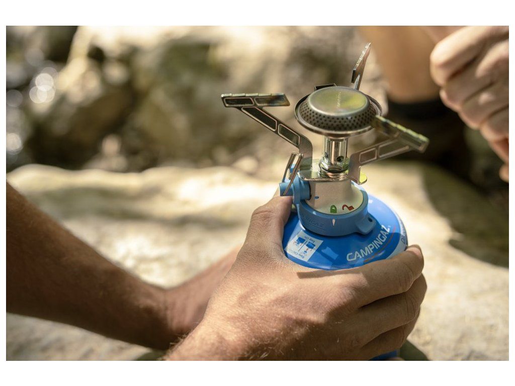 Moderní turistický kartušový vařič je vybaven novým systémem Easy Clic Connect, který umožňuje bezpečné a uživatelsky přívětivé připojení ke kartuši. Na první pohled poznáte, zda je vařič pevně uzavřen a připraven k použití. Pokud spojení není bezpečné, integrovaná bezpečnostní pojistka automaticky zablokuje regulátor a zabrání úniku plynu.