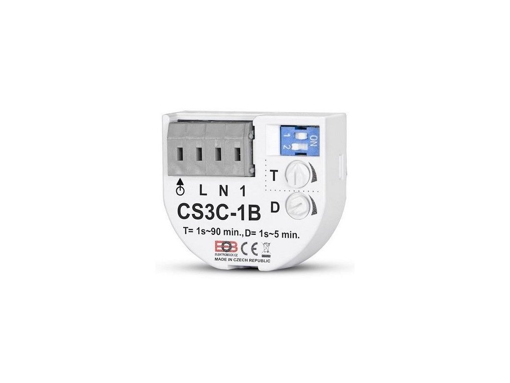 Časový spínač pod vypínač CS3C-1B Elektrobock Spínač pod vypínač s bezšroubovými svorkami vhodný pro spínání ventilátorů s možností nastavení zpoždění.Vlastnosti CS3C-1B:Slouží ke zpožděnému zapnutí a vypnutí ventilátoru v závislosti na osvětlení. Ke spuštění ventilátoru dojde 1s až 5min po zapnutí osvětlení. Nastavení se provádí trimrem D(delay=zpoždění), pomocí malého šroubováku. K odpojení ventilátoru dojde v době 1s až 1,5h po vypnutí osvětlení, nastavení času hrubě přepínačem a jemně trimrem T(time=čas).