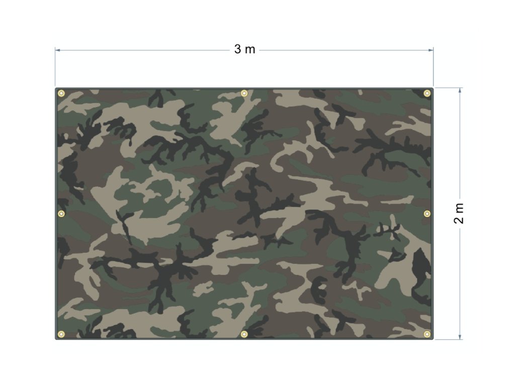 Lehká celta v lesní kamufláži s rozměry 2 x 3 m.
