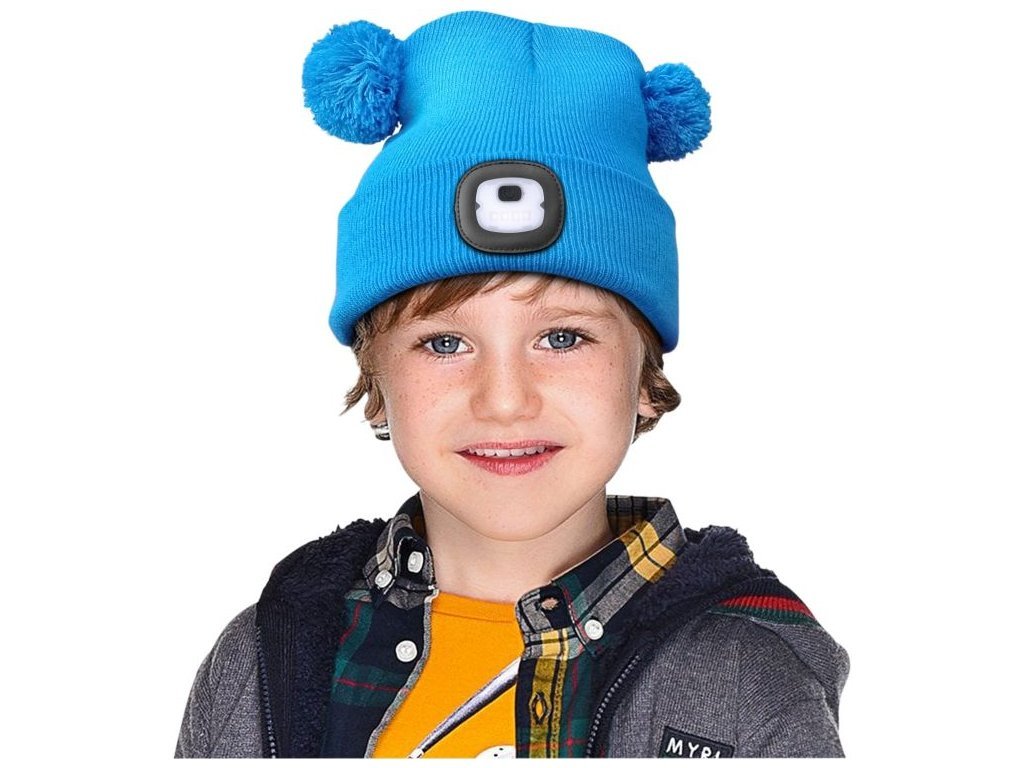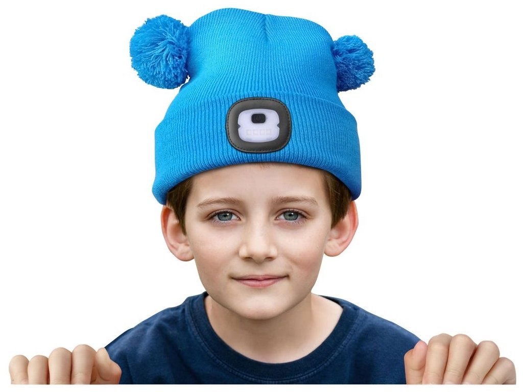 čepice s čelovkou 4x25lm, USB nabíjení, modrá s bambulemi, dětská