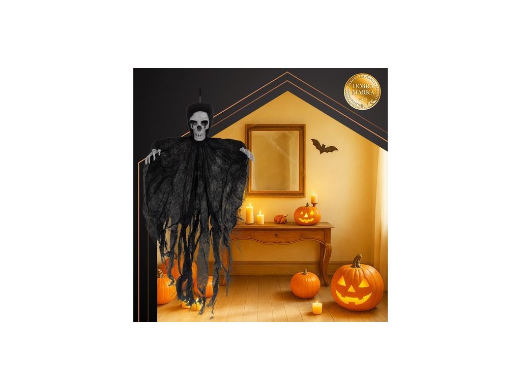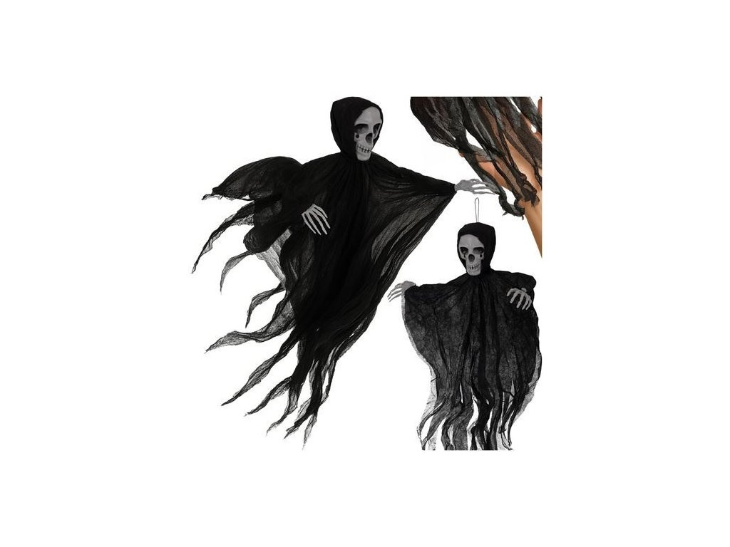 Černá závěsná kostra, HALLOWEEN, Ruhhy Vytvořte strašidelnou atmosféru s touto závěsnou dekorací ducha s hlavou kostlivce! Perfektní doplněk na Halloween, večírky nebo tematickou výzdobu interiéru i exteriéru. Černá kostra se závojovitým tělem a realistickou lebkou dodá vašemu prostoru nádech tajemna. Díky poutku ji snadno zavěsíte na strop, dveře nebo strom.Dekorace má lehkou konstrukci a látkový efekt roztrhané gázy, která se vevětru jemně pohybuje a vytváří strašidelný efekt. Vhodná pro použití doma, na zahradě, v kanceláři či v obchodě.
